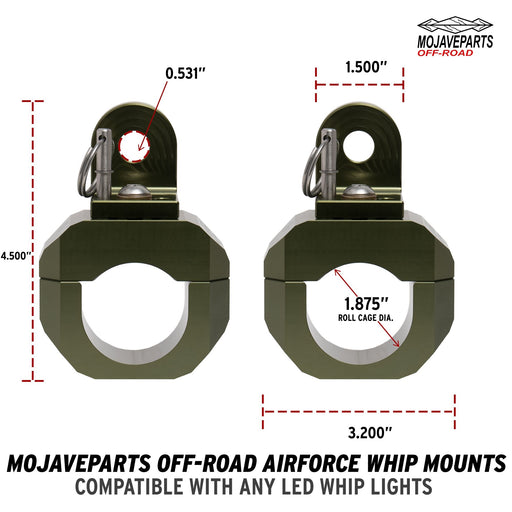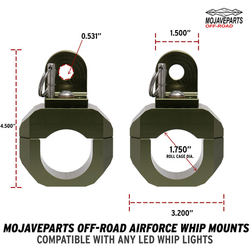 AIRFORCE WHIP MOUNT FOR CAN-AM, Polaris, Yamaha, Honda, Kawasaki, CF Moto, Artic-Cat, Go Cart, Hinsun Strike, and Segway 2.000" ROLL CAGE MILITARY GREEN (PAIR)MOJAVEPARTS OFFROADOriginal price $149.98 - Original price $149.98Original price$149.98$149.98 - $149.98Current price $149.98| /In stockAIRFORCE WHIP MOUNT 2.000" DETENT PIN MILITARY GREEN (PAIR) Airforce Whip Mounts are designed to pull the new heavy-duty .250 Dia. quick-release pi... View full detailsOriginal price $149.98 - Original price $149.98Original price$149.98$149.98 - $149.98Current price $149.98| /