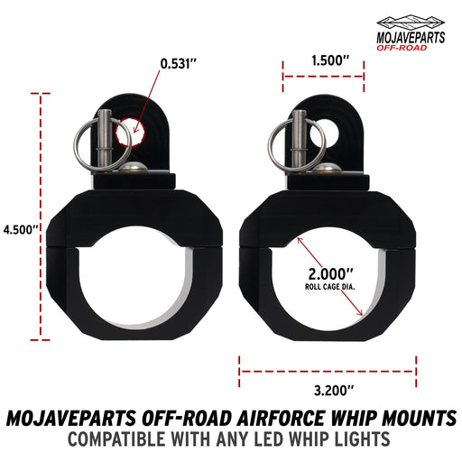 AIRFORCE WHIP MOUNT FOR CAN-AM, Polaris, Yamaha, Honda, Kawasaki, CF Moto, Artic-Cat, Go Cart, Hinsun Strike, and Segway 2.000" ROLL CAGE BLACK ANODIZED (PAIR)MOJAVEPARTS OFFROADOriginal price $149.98 - Original price $149.98Original price$149.98$149.98 - $149.98Current price $149.98| /In stockAIRFORCE WHIP MOUNT 2.000" DETENT PIN BLACK (PAIR) Airforce Whip Mounts are designed to pull the new heavy-duty .250 Dia. quick-release pin and til... View full detailsOriginal price $149.98 - Original price $149.98Original price$149.98$149.98 - $149.98Current price $149.98| /